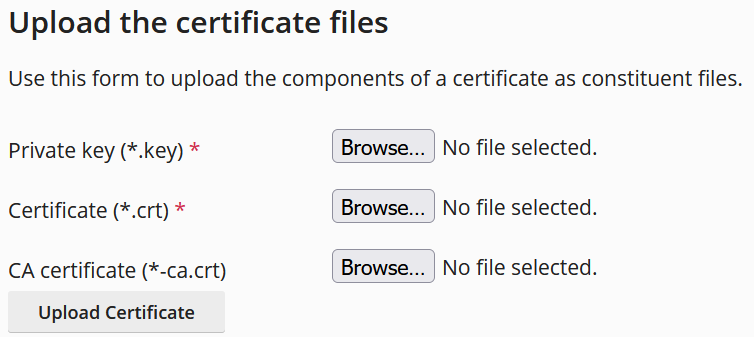Browse each file (it doesn’t matter that they’re cer rather than crt), use _INTERMEDIATE.cer for the CA certificate, then click Upload Certificate.